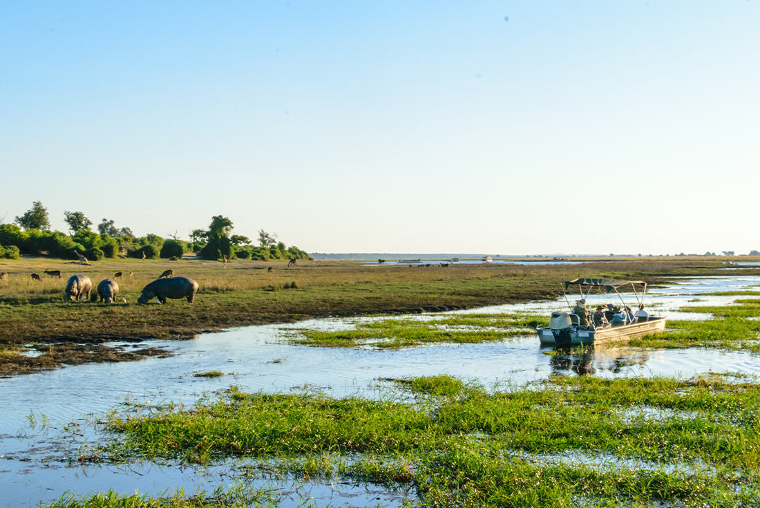 This morning, you’ll head to the Okavango Delta – known for its sprawling grassy plains that flood seasonally, making the delta a lush animal habitat. When you arrive, board speedboats and make your way to your home for the next two nights – a houseboat in the Okavango Delta Panhandle. You can chill out on the deck or grab a few friends and attempt one of the onsite board games. For dinner, your captain will serve dinner on the deck, and you can watch the sunset while you eat and listen to the sounds of the nearby hippos on the water's edge.